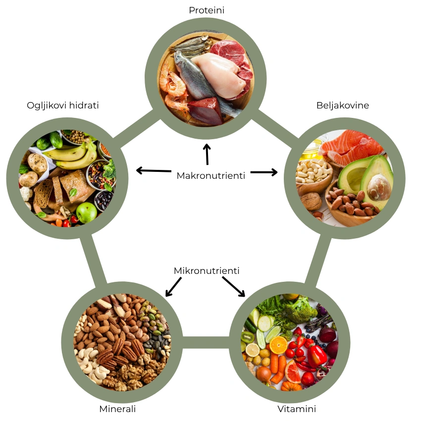 | Makrohranila (ogljikovi hidrati, beljakovine, maščobe) | – Zagotavljajo energijo za vse telesne funkcije in telesno dejavnost. – Gradijo in obnavljajo tkiva (mišice, koža, organi). – Podpirajo delovanje hormonov, encimov in imunskega sistema. | Polnozrnata žita, stročnice, ribe, pusto meso, jajca, mlečni izdelki, oljčno olje, oreščki, semena, avokado. |