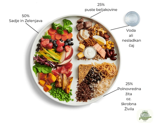 - 50% krožnika: različna zelenjava in sadje (prednost imajo lokalni, sezonski in manj predelani pridelki).